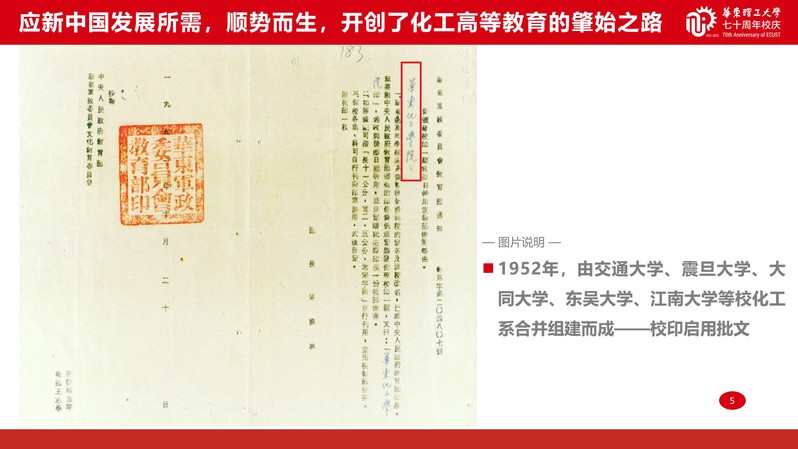 应新中国发展所需,顺势而生,学校开创了化工高等教育的肇始之路。1952年,应国家建设需要,按照“培养工业建设人才、发展专门学院”的原则,交通大学、震旦大学、大同大学、东吴大学、江南大学等校化工系强强联合,化学化工领域的高端人才辐辏云集,创建了华东化工学院。建校初期,学校设有3个系、5个专业,满怀理想信念的老一辈华理人勤奋求实、艰苦创业,用智慧和汗水铸就了一个又一个辉煌。短短八年,学校就跻身全国重点大学行列,成为新中国创办的第一所以化工特色闻名的高等学府。