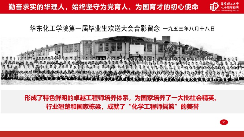 回望70年的办学历程,勤奋求实的华理人,始终坚守为党育人、为国育才的初心使命。从建校初期首创化学与制药工学、抗生素制造工学、重有机合成、化学工程、感光材料、玻璃钢等专业,为国家快速发展提供人才支撑;到上世纪50年代末,应国家原子能事业发展需求创建第二无机工业系;再到当下成立碳中和未来技术学院等培养国家急需紧缺人才;从全面工程教育,到绿色工程教育,再到新工科;从“培养高级工业专门人才”,到“少而精,学到手”,到“合格+特色”,到“厚基础,强实践”,再到“创新型人才”,华理形成了特色鲜明的卓越工程师培养体系,为国家培养了一大批社会精英、行业翘楚和国家栋梁,成就了“化学工程师摇篮”的美誉。