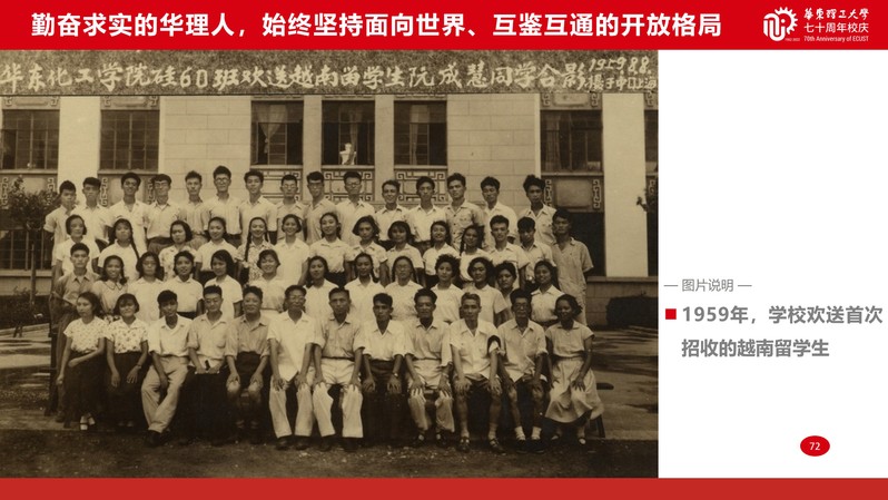 回望70年的办学历程,勤奋求实的华理人,始终永葆爱党爱国、奉献担当的家国情怀。从1952年新中国百废待兴、百业待举之际创建,到1965年响应祖国号召参与“大三线”建设,在四川黄坡岭上“舍小家、顾大家”建设西南分院,再到引领我国高等教育改革风气之先;从2008年组建上海第一支汶川地震灾后社工服务队,到2018年助力云南寻甸实现高质量脱贫摘帽,再到2022年疫情防控大上海保卫战,一代代华理人以殷殷家国情怀、拳拳赤子之心报效国家,在经济发展、学术繁荣、英才培养、社会服务和大国利器铸造中展现了华理担当。