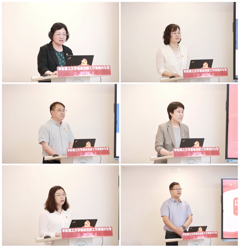 会上,化学学院党委书记张文清、资环学院党委书记修光利分别汇报了“全国党建工作标杆院系”和“上海党建工作标杆院系”建设成效。马克思主义学院党委副书记兼纪委书记卢杨、药学院药物科学系教工党支部书记黄瑾分别汇报了“全国党建工作样板支部”“上海党建工作样板支部”创建工作开展情况。机动学院博士生第二党支部书记聂文睿汇报了“全国高校百个研究生样板党支部”创建工作开展情况。教工部部长钱嫦萍、学工部部长崔姗姗、教务处处长黄婕、研工部部长孙洪锋等代表相关职能部处就做好基层党建工作作了交流发言。